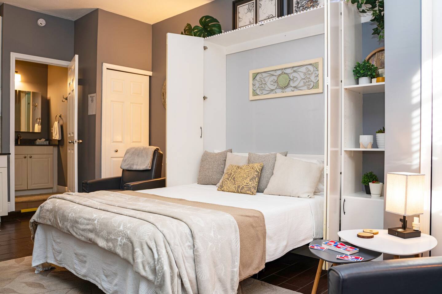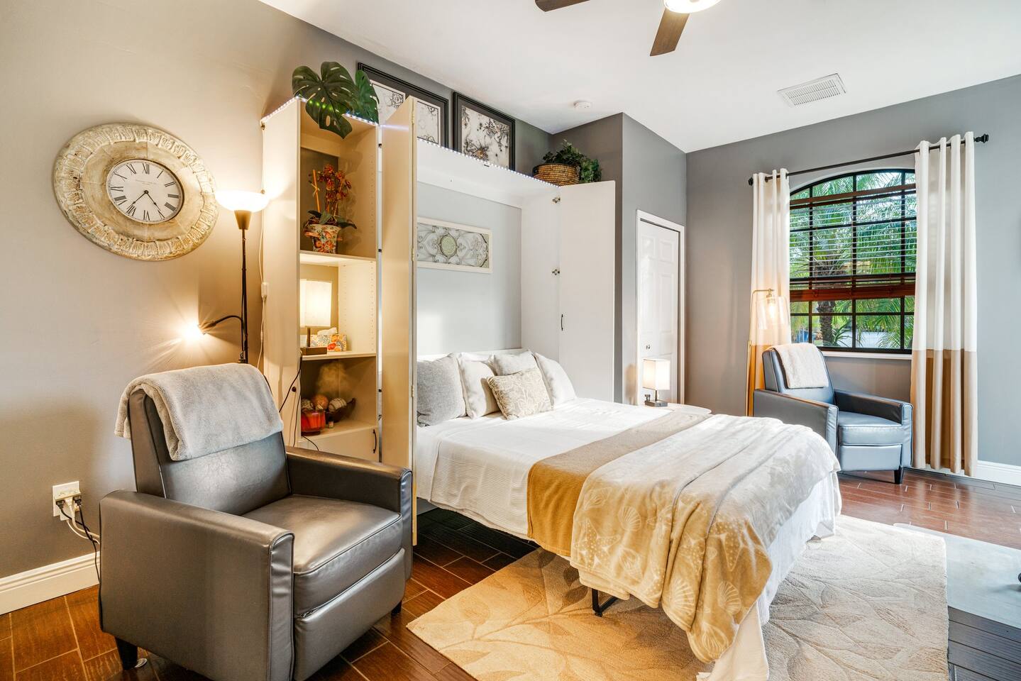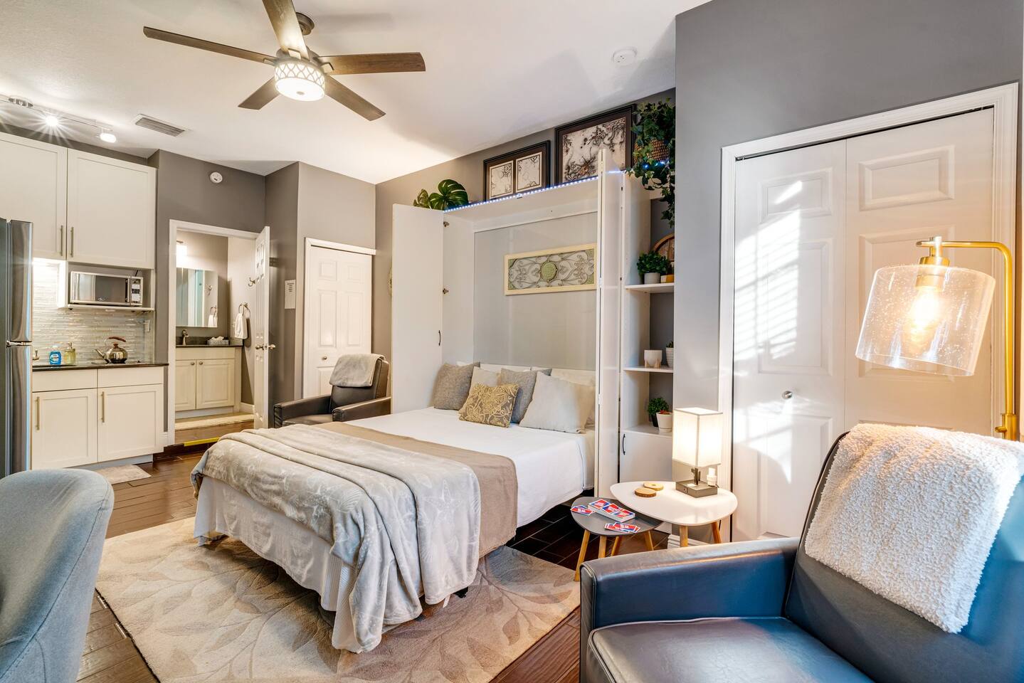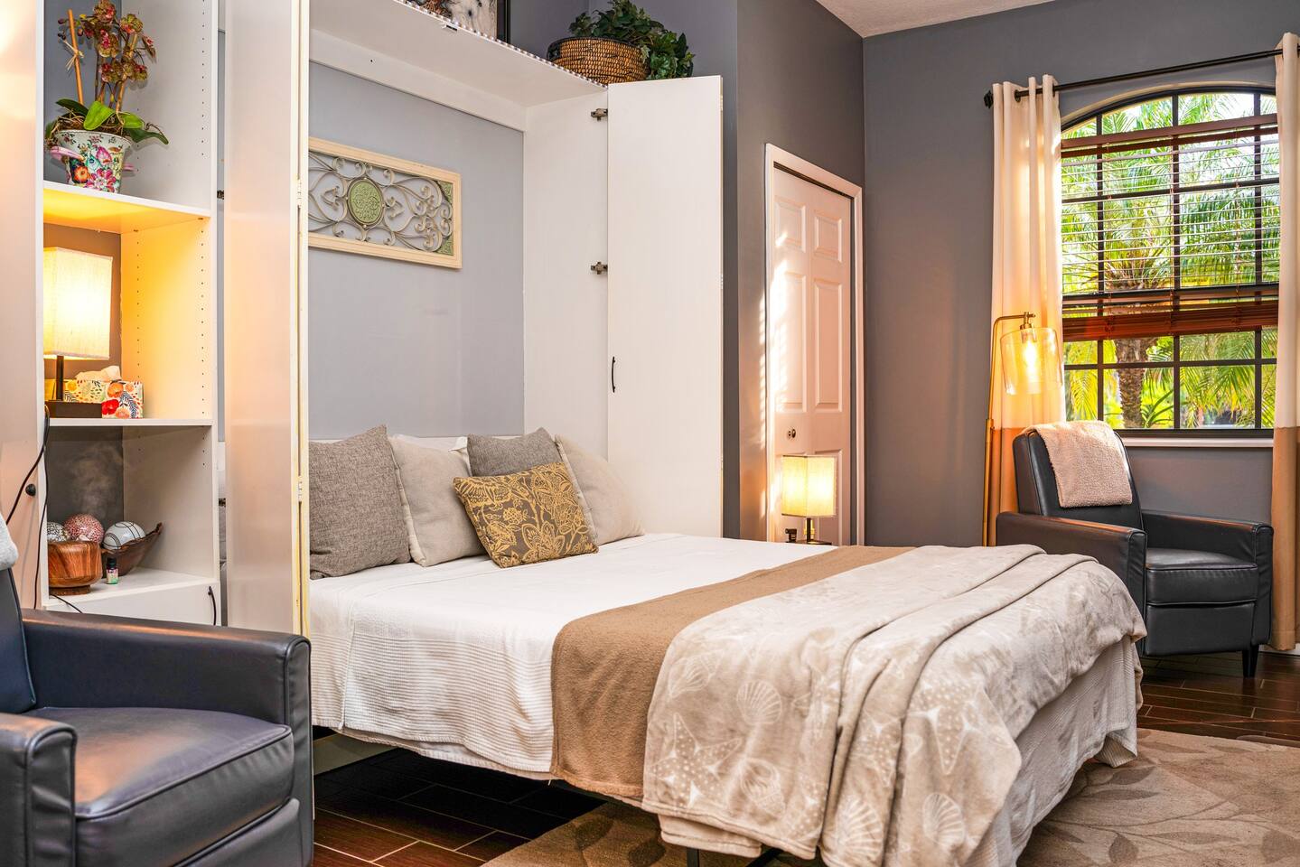 Your private, pet-friendly Backyard Oasis Studio is a waterfront retreat perfect for couples or solo travelers, nestled on the edge of a serene pond. The studio is attached to the main home's garage but has its own private entrance, ensuring a peaceful and completely separate space. Private Studio Retreat: - Living & Sleeping: Features a comfortable Queen-size Murphy bed, a TV, and room-darkening shades. The space is kept comfortable with a split type ductless A/C and heating system, plus a ceiling fan. - Kitchenette: A well-equipped space with a full-size refrigerator, stove, toaster oven, microwave, and both Keurig and drip coffee makers. Welcome snacks are provided. - Dedicated Workspace: Includes a full desk with office supplies and property-wide Wi-Fi. - Bathroom: A clean, modern full bathroom with a shower/tub combination, essential hygiene products, and fresh towels. Shared Backyard Oasis: Step outside to enjoy incredible shared amenities: - Pool & Hot Tub: A sparkling, freeform swimming pool and a bubbling hot tub. - Lounge & Dine: A comfortable sectional sofa in the covered gazebo and an outdoor dining area. - Fire Pit & Grill: A stone fire pit for evening relaxation and a propane BBQ for grilling.