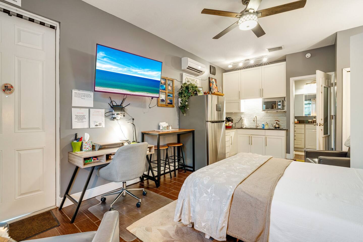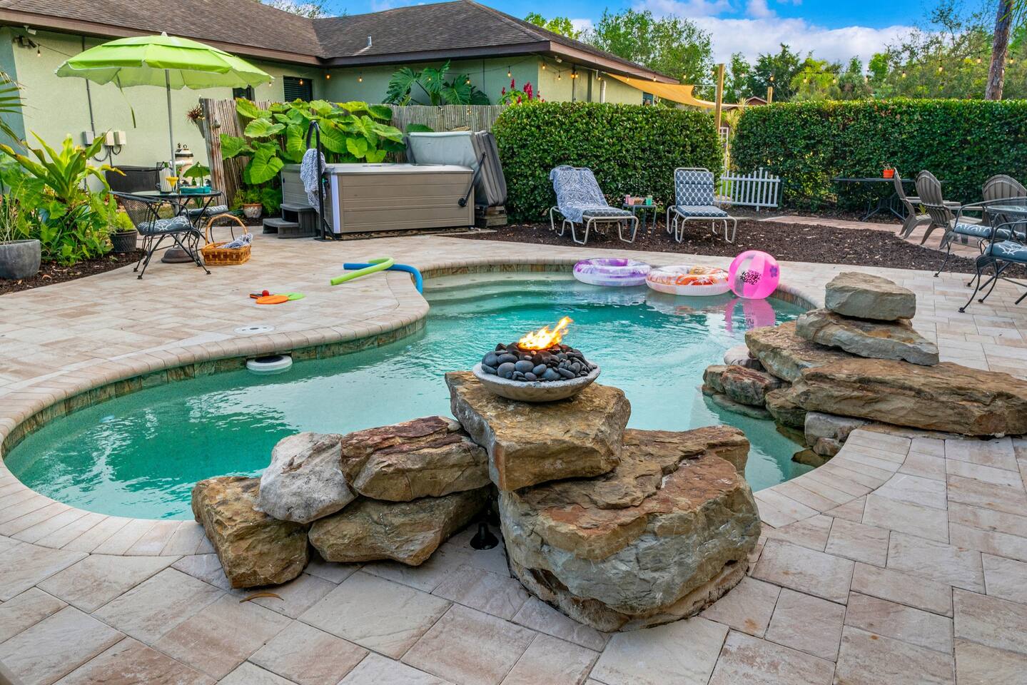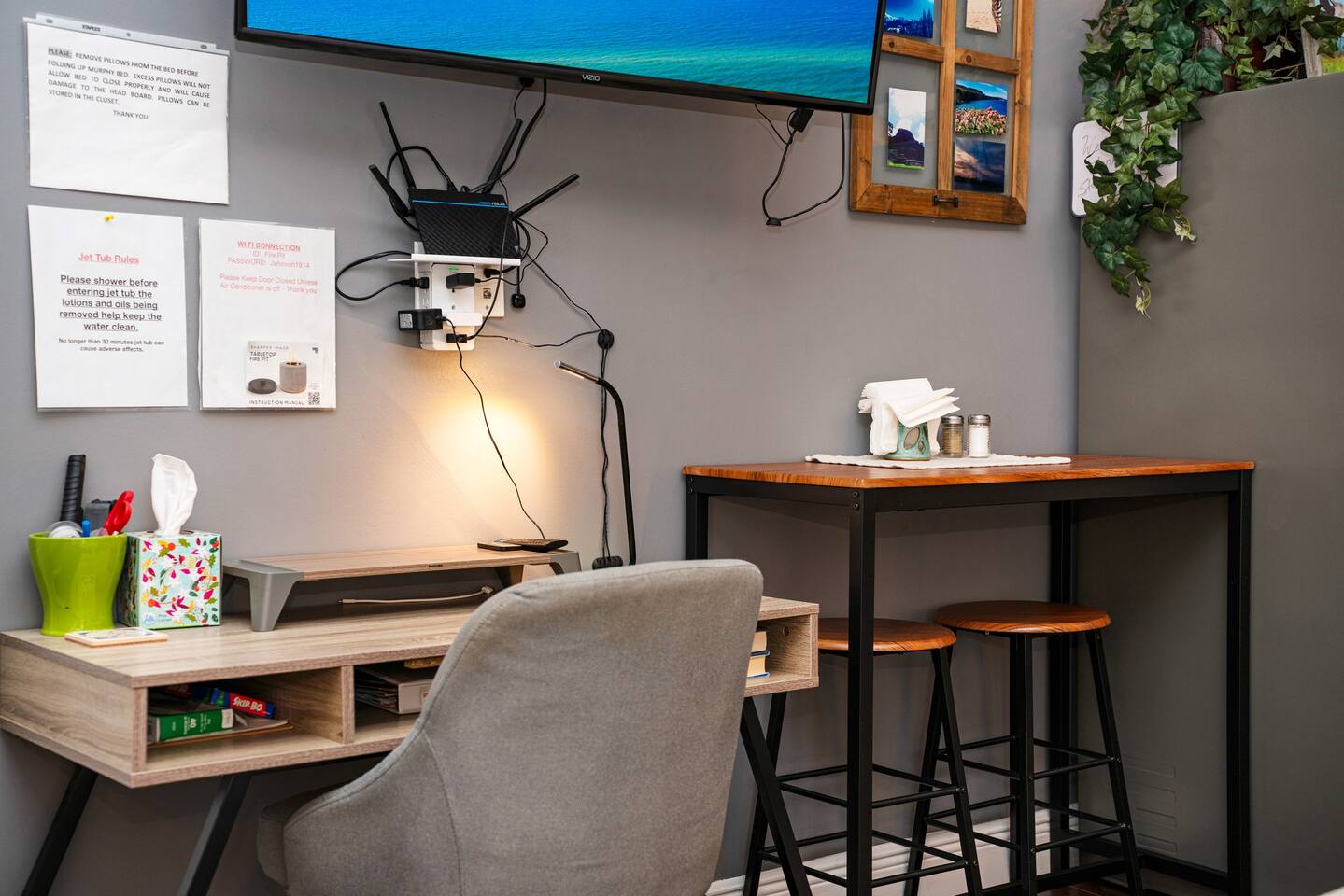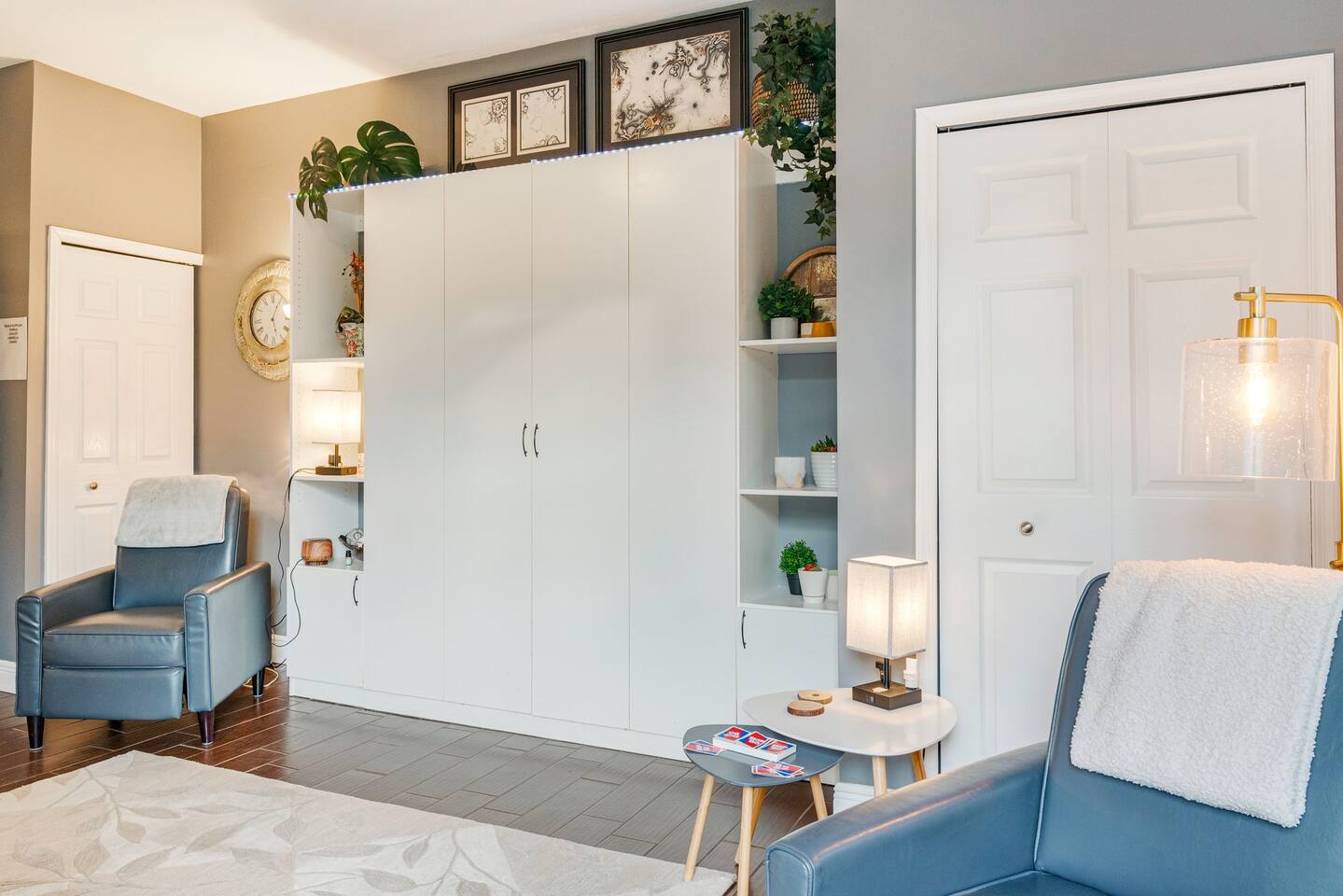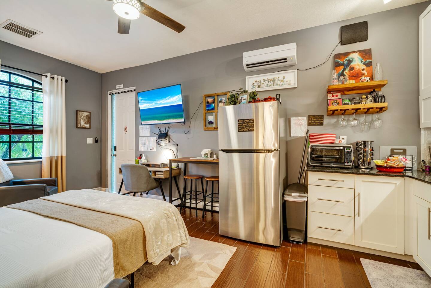 Your private, pet-friendly Backyard Oasis Studio is a waterfront retreat perfect for couples or solo travelers, nestled on the edge of a serene pond. The studio is attached to the main home's garage but has its own private entrance, ensuring a peaceful and completely separate space. Private Studio Retreat: - Living & Sleeping: Features a comfortable Queen-size Murphy bed, a TV, and room-darkening shades. The space is kept comfortable with a split type ductless A/C and heating system, plus a ceiling fan. - Kitchenette: A well-equipped space with a full-size refrigerator, stove, toaster oven, microwave, and both Keurig and drip coffee makers. Welcome snacks are provided. - Dedicated Workspace: Includes a full desk with office supplies and property-wide Wi-Fi. - Bathroom: A clean, modern full bathroom with a shower/tub combination, essential hygiene products, and fresh towels. Shared Backyard Oasis: Step outside to enjoy incredible shared amenities: - Pool & Hot Tub: A sparkling, freeform swimming pool and a bubbling hot tub. - Lounge & Dine: A comfortable sectional sofa in the covered gazebo and an outdoor dining area. - Fire Pit & Grill: A stone fire pit for evening relaxation and a propane BBQ for grilling.