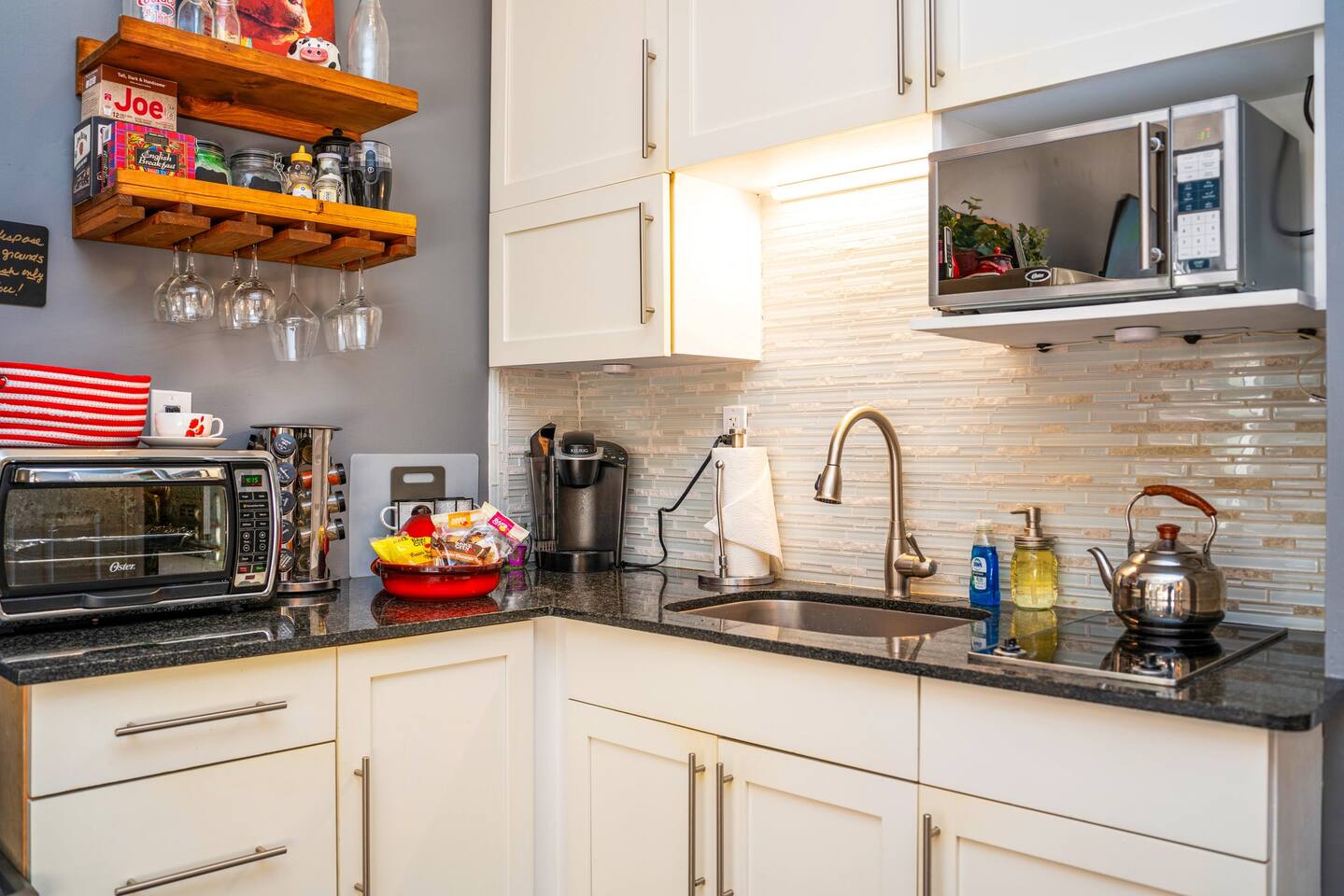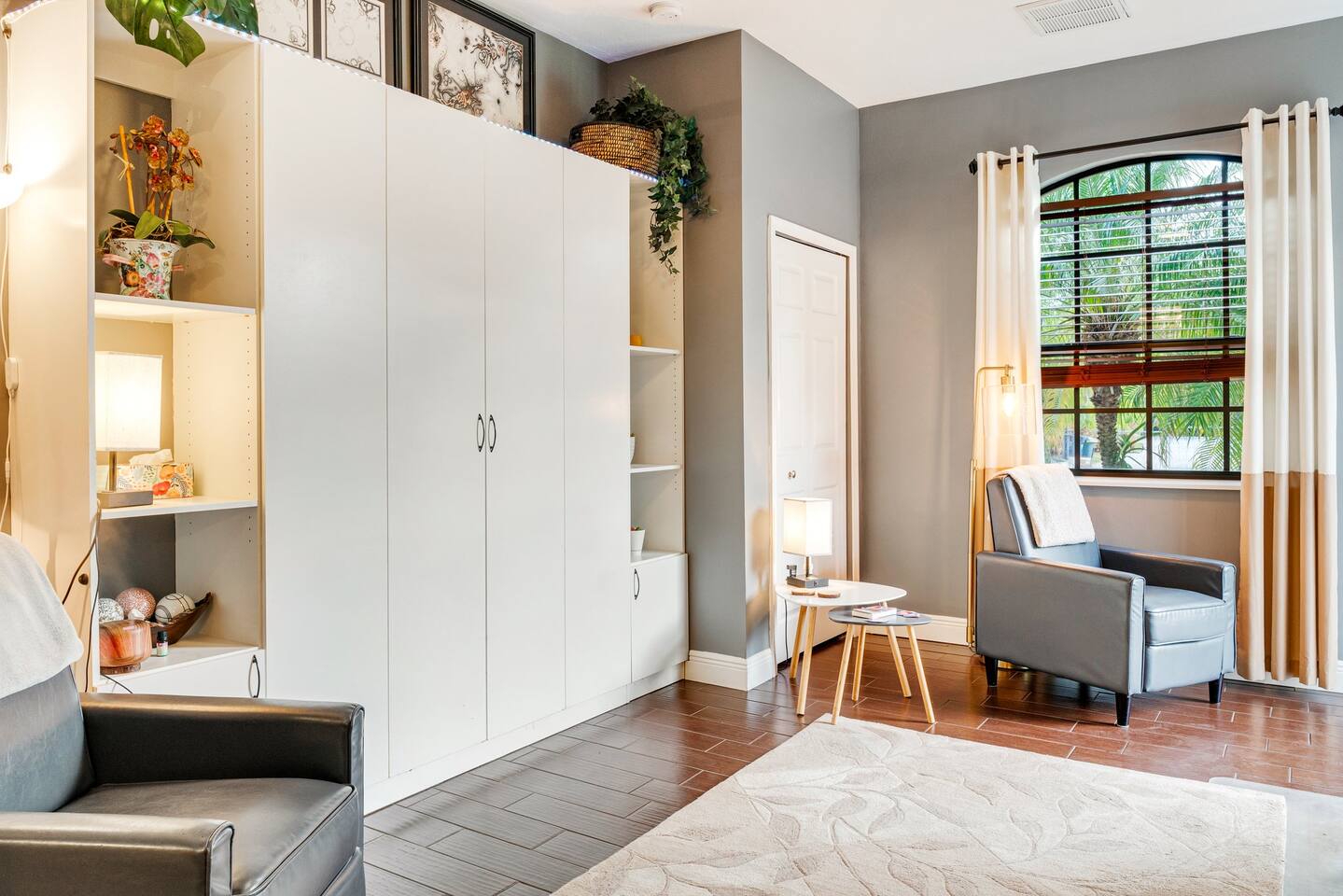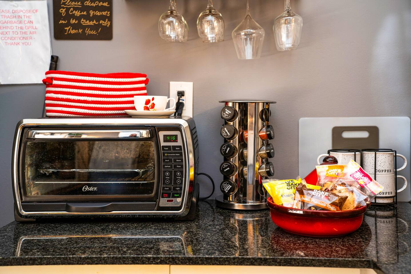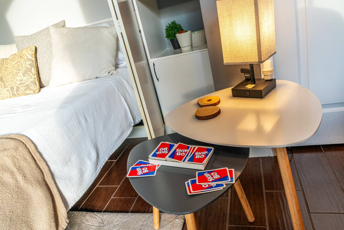 Your private, pet-friendly Backyard Oasis Studio is a waterfront retreat perfect for couples or solo travelers, nestled on the edge of a serene pond. The studio is attached to the main home's garage but has its own private entrance, ensuring a peaceful and completely separate space. Private Studio Retreat: - Living & Sleeping: Features a comfortable Queen-size Murphy bed, a TV, and room-darkening shades. The space is kept comfortable with a split type ductless A/C and heating system, plus a ceiling fan. - Kitchenette: A well-equipped space with a full-size refrigerator, stove, toaster oven, microwave, and both Keurig and drip coffee makers. Welcome snacks are provided. - Dedicated Workspace: Includes a full desk with office supplies and property-wide Wi-Fi. - Bathroom: A clean, modern full bathroom with a shower/tub combination, essential hygiene products, and fresh towels. Shared Backyard Oasis: Step outside to enjoy incredible shared amenities: - Pool & Hot Tub: A sparkling, freeform swimming pool and a bubbling hot tub. - Lounge & Dine: A comfortable sectional sofa in the covered gazebo and an outdoor dining area. - Fire Pit & Grill: A stone fire pit for evening relaxation and a propane BBQ for grilling.