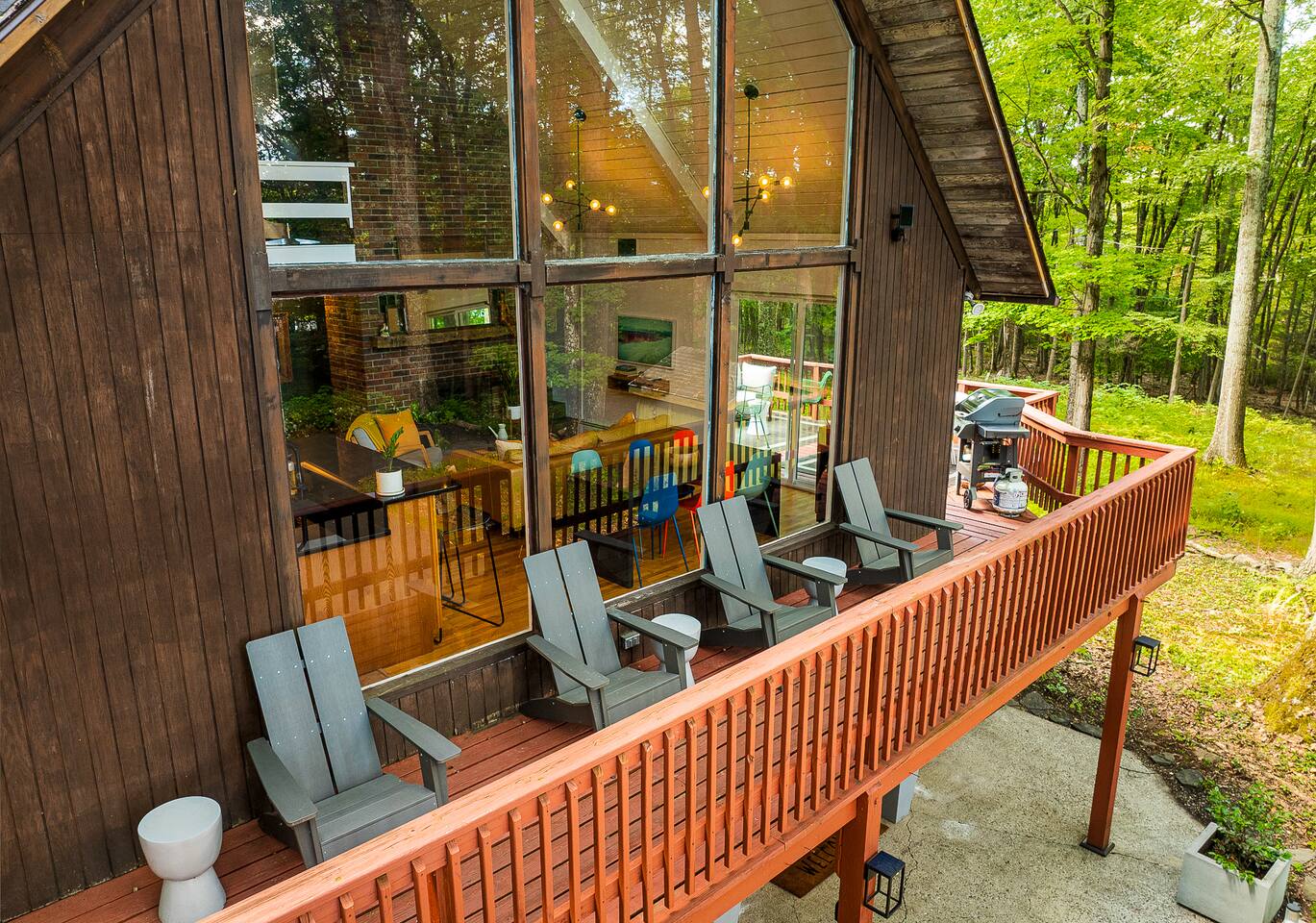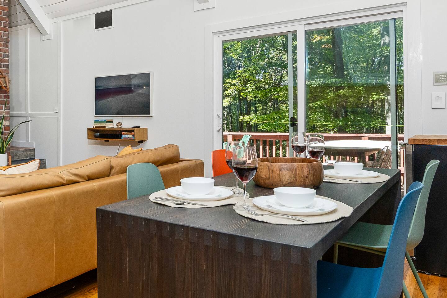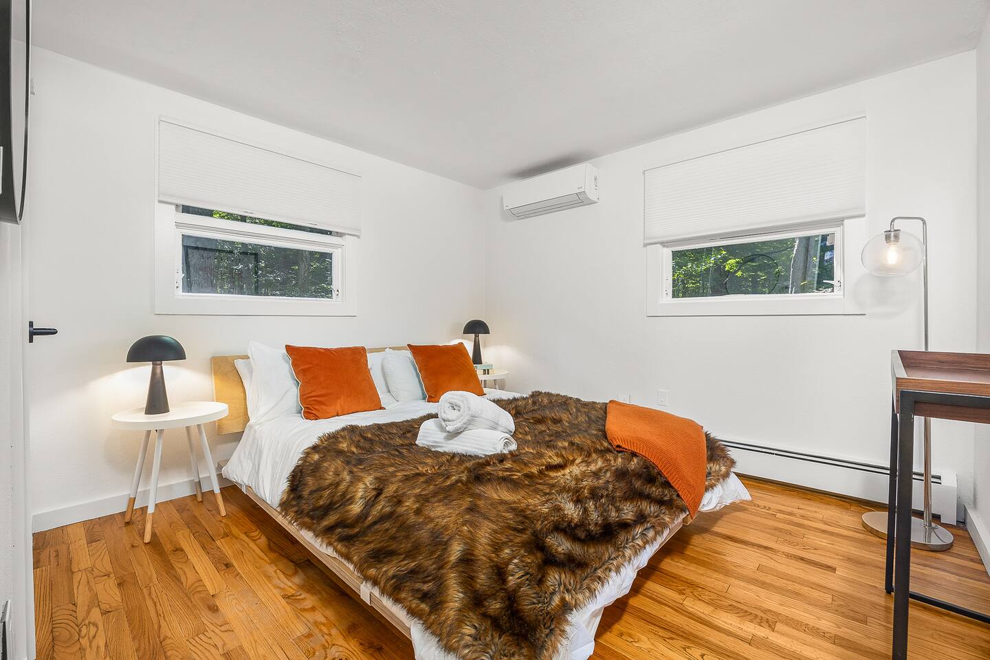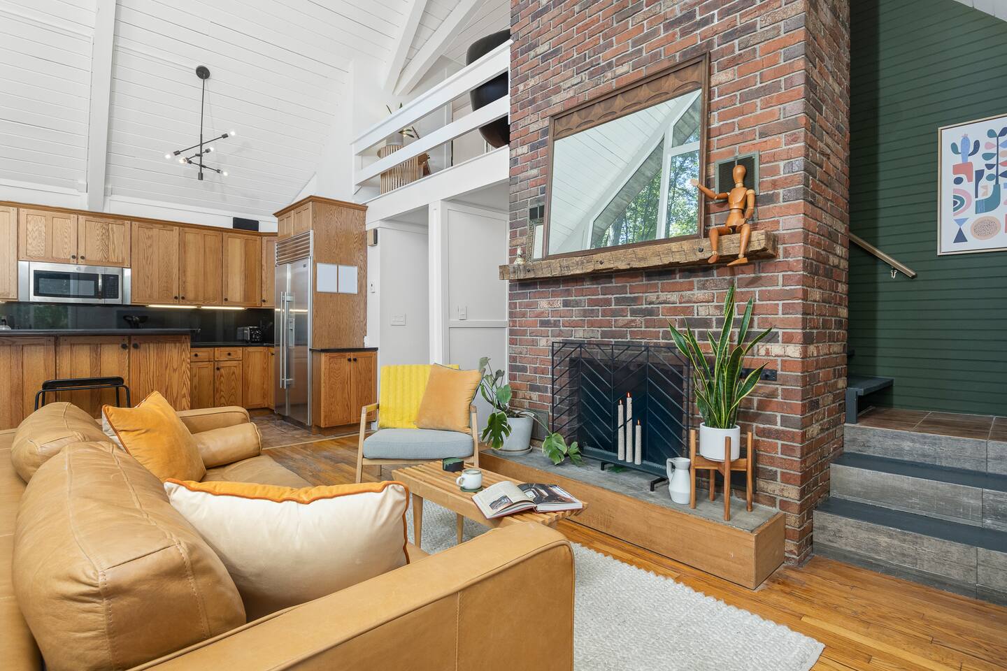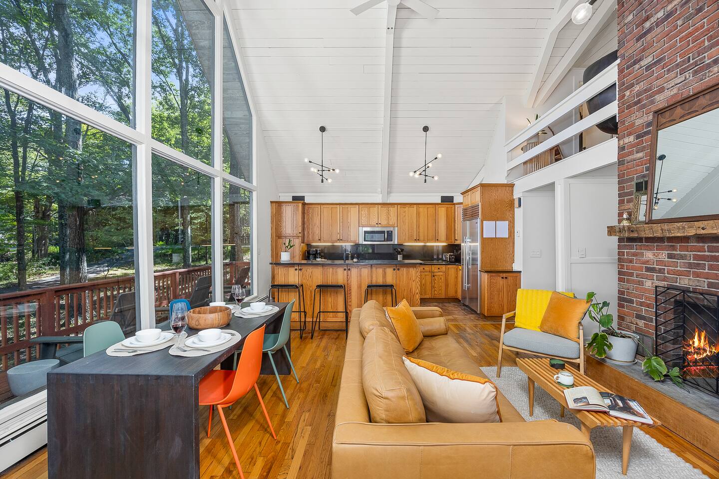 Escape to Leitchfield, your cozy cabin retreat nestled in the woods of Middletown, NY. This modern A-frame cabin blends rustic charm with contemporary comforts, creating the perfect setting for relaxation and reconnection. High vaulted ceilings, a ceiling fan, and large windows fill the open-concept living space with beautiful natural light, inviting you to unwind from the moment you arrive. Bed & Bath - Bedroom 1: A serene primary suite with a King bed, and clothing storage. - Bedroom 2: A comfortable room with a Queen bed and cozy lighting. - Bedroom 3: A quiet space with a Queen bed and closet, perfect for reading or remote work. - Amenities: Enjoy premium linens from Parachute & Brooklinen, shower amenities from Public Goods, and a hairdryer. Kitchen & Dining - A fully equipped kitchen featuring a Sub-Zero fridge, stove, oven, microwave, and a brand new Air Fryer. - Coffee Station: Drip and Keurig coffee makers are available. - Essentials: The kitchen is stocked with cookware, wine glasses, and cooking basics like oil and salt. - Dining Area: Gather around the dining table with seating for six. Indoor Comforts - Entertainment: Relax with our Sonos Stereo System and an HD TV with Amazon Prime, Hulu, Apple TV, and Chromecast (personal logins required). - Connectivity: Stay connected with fast WiFi and an Ethernet option. - Unplug: Enjoy our collection of books and board games. - Climate Control: The home is kept comfortable year-round with a modern ductless heating and air conditioning system. Outdoor Oasis - Private Deck: Unwind on the spacious deck with seating nestled among the trees. - Firepit: Gather around the firepit in Adirondack chairs for an evening of conversation and stargazing. - Grill & Dine: Fire up the BBQ grill for a summer cookout and dine al fresco at the outdoor table for six, illuminated by ambient evening lights.