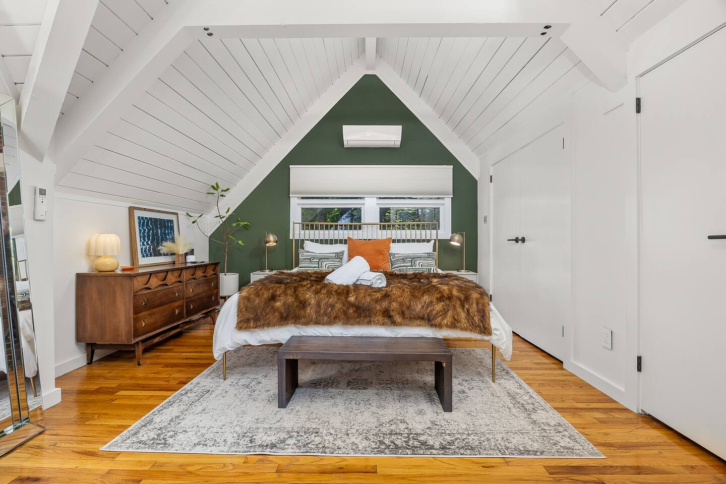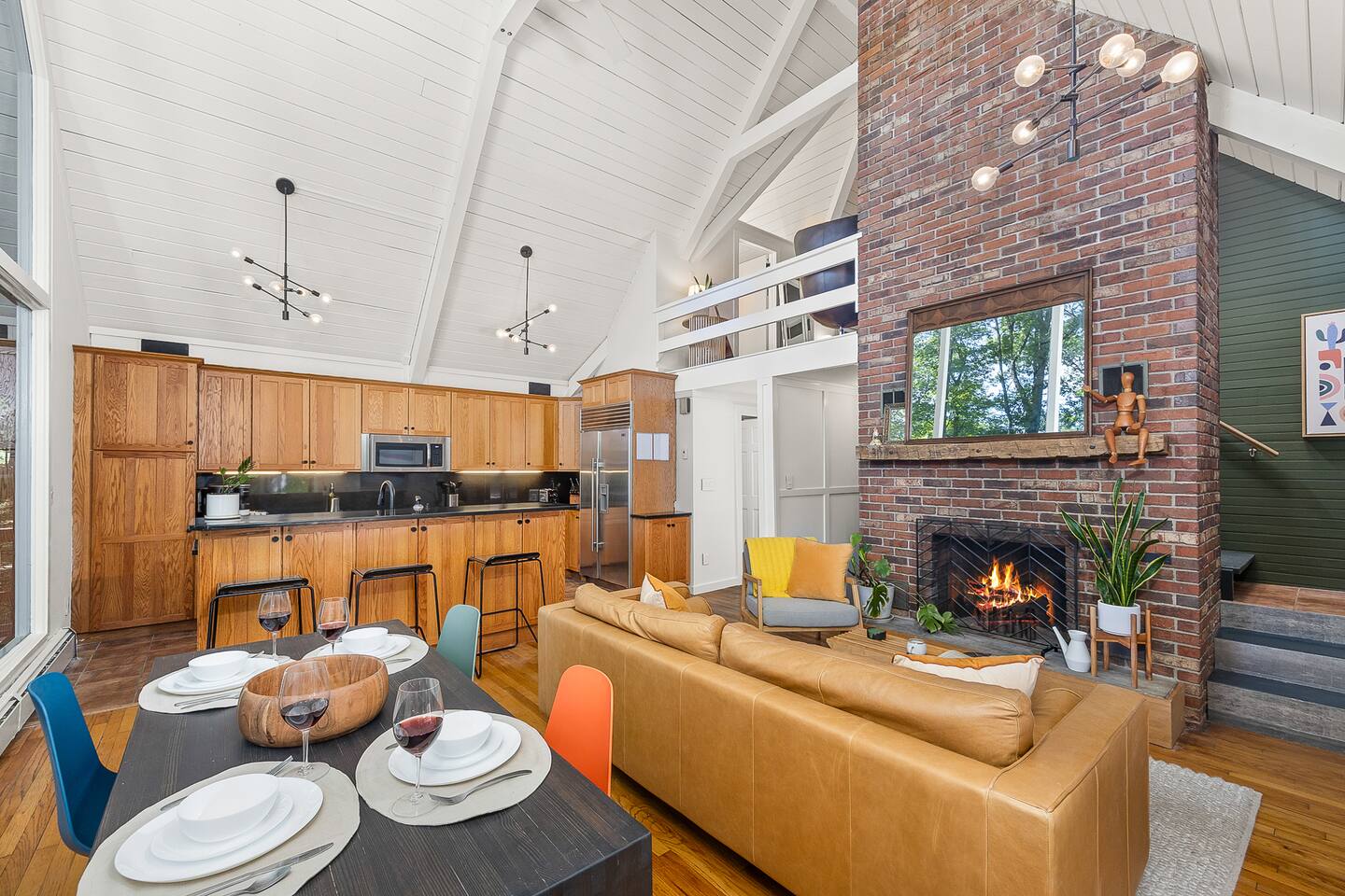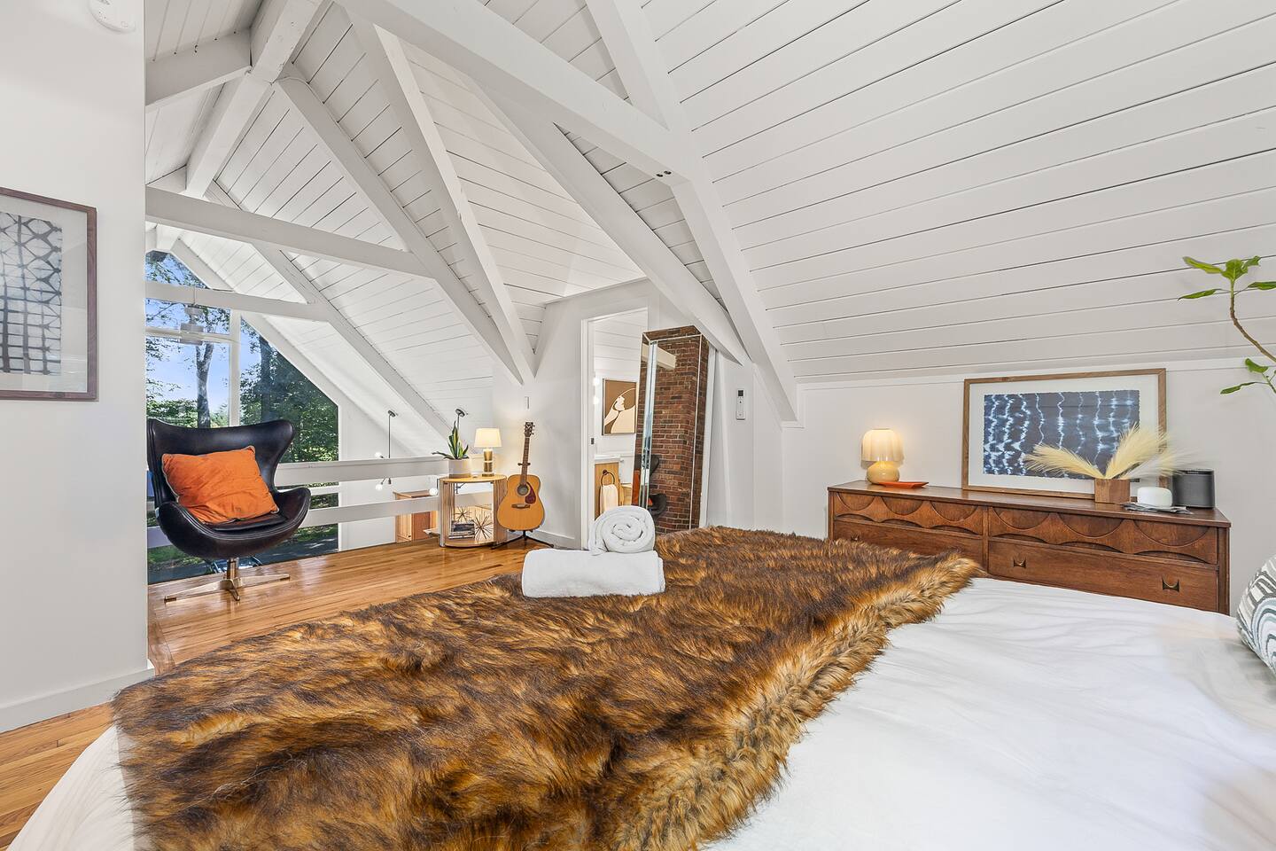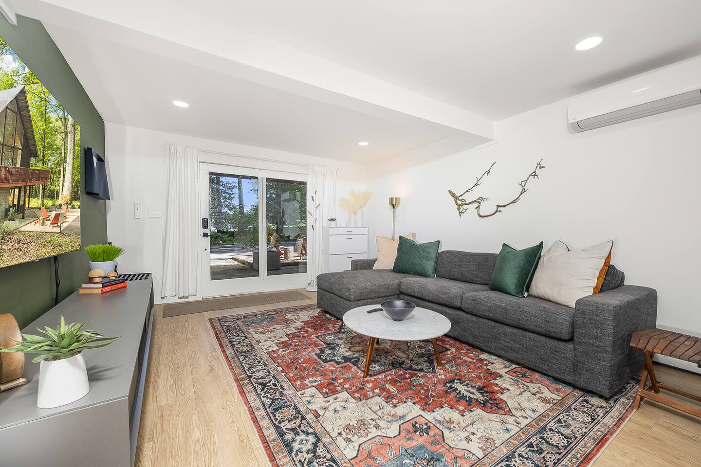 Escape to Leitchfield, your cozy cabin retreat nestled in the woods of Middletown, NY. This modern A-frame cabin blends rustic charm with contemporary comforts, creating the perfect setting for relaxation and reconnection. High vaulted ceilings, a ceiling fan, and large windows fill the open-concept living space with beautiful natural light, inviting you to unwind from the moment you arrive. Bed & Bath - Bedroom 1: A serene primary suite with a King bed, and clothing storage. - Bedroom 2: A comfortable room with a Queen bed and cozy lighting. - Bedroom 3: A quiet space with a Queen bed and closet, perfect for reading or remote work. - Amenities: Enjoy premium linens from Parachute & Brooklinen, shower amenities from Public Goods, and a hairdryer. Kitchen & Dining - A fully equipped kitchen featuring a Sub-Zero fridge, stove, oven, microwave, and a brand new Air Fryer. - Coffee Station: Drip and Keurig coffee makers are available. - Essentials: The kitchen is stocked with cookware, wine glasses, and cooking basics like oil and salt. - Dining Area: Gather around the dining table with seating for six. Indoor Comforts - Entertainment: Relax with our Sonos Stereo System and an HD TV with Amazon Prime, Hulu, Apple TV, and Chromecast (personal logins required). - Connectivity: Stay connected with fast WiFi and an Ethernet option. - Unplug: Enjoy our collection of books and board games. - Climate Control: The home is kept comfortable year-round with a modern ductless heating and air conditioning system. Outdoor Oasis - Private Deck: Unwind on the spacious deck with seating nestled among the trees. - Firepit: Gather around the firepit in Adirondack chairs for an evening of conversation and stargazing. - Grill & Dine: Fire up the BBQ grill for a summer cookout and dine al fresco at the outdoor table for six, illuminated by ambient evening lights.