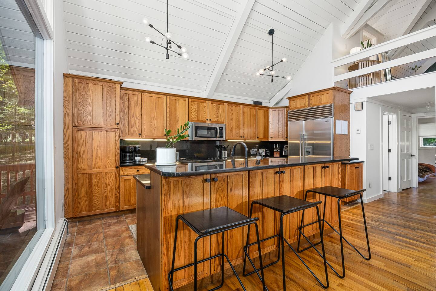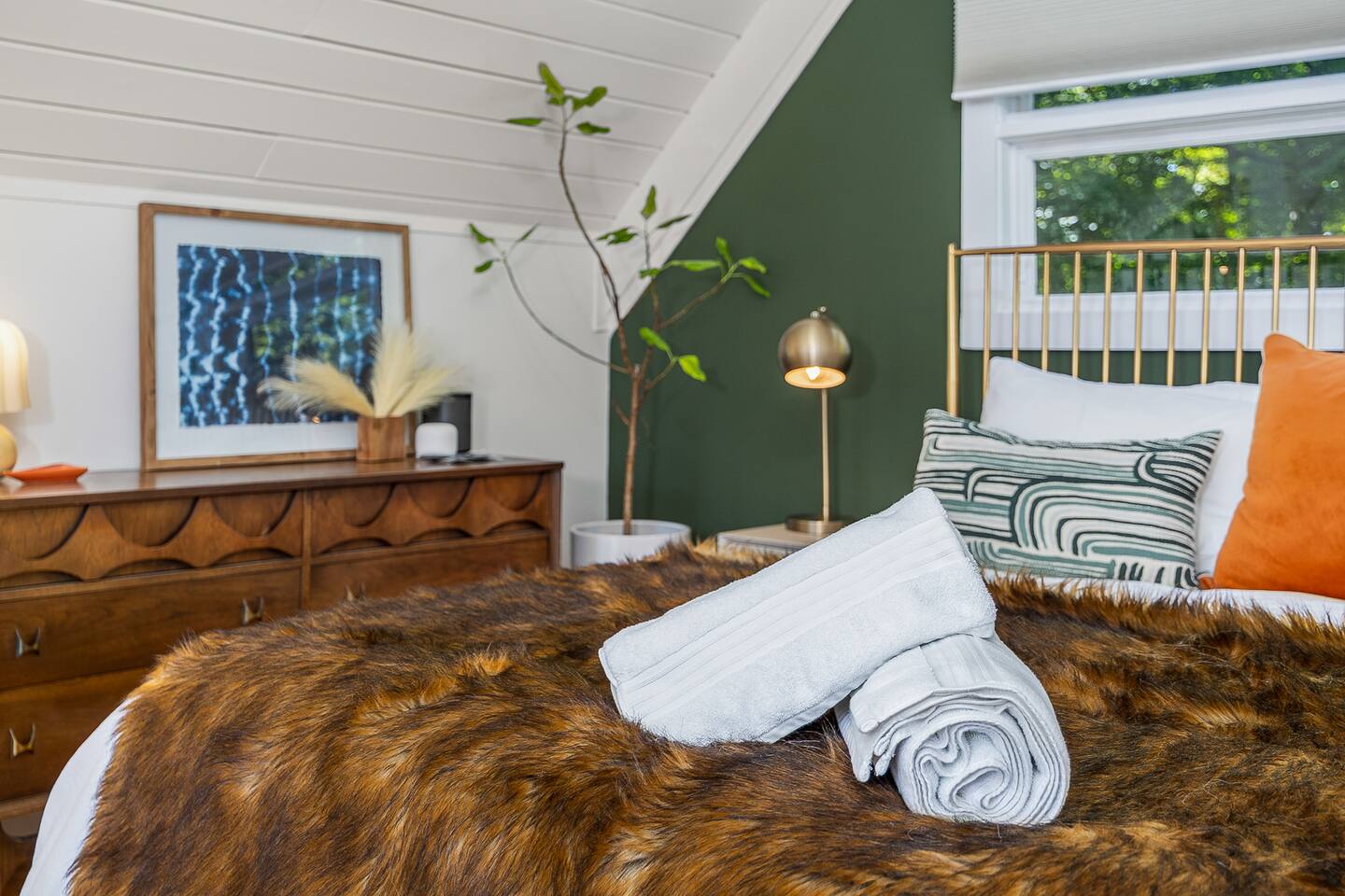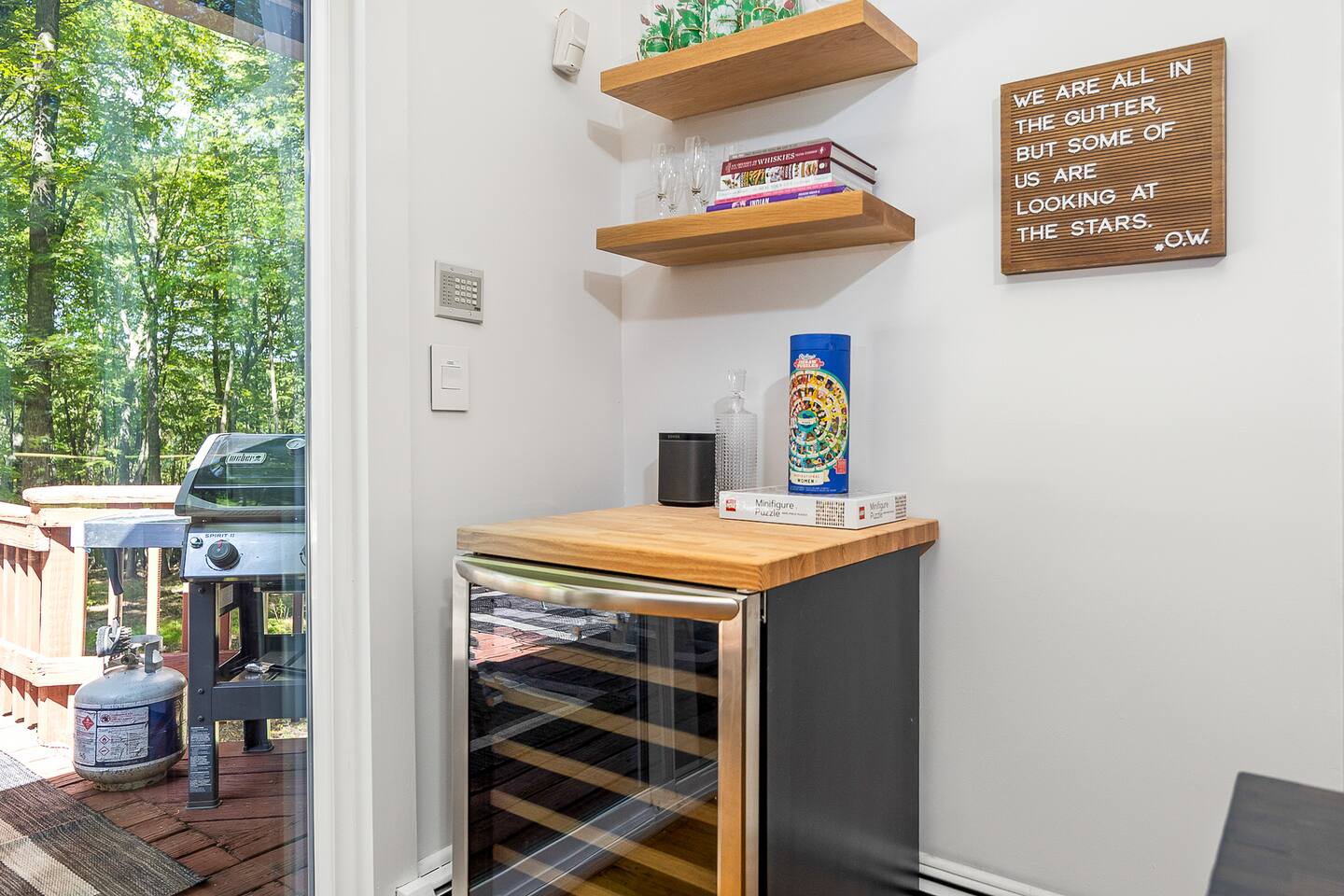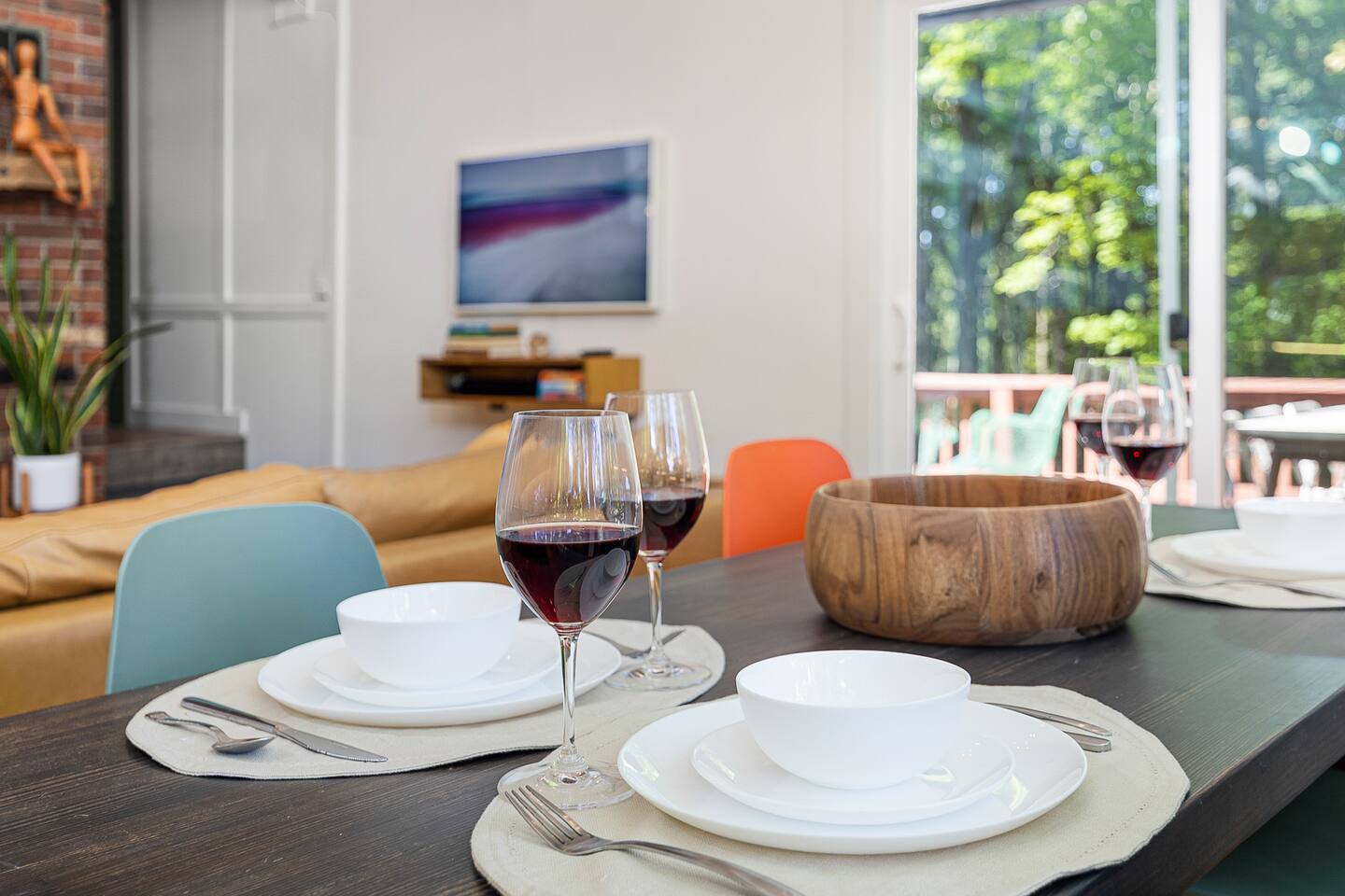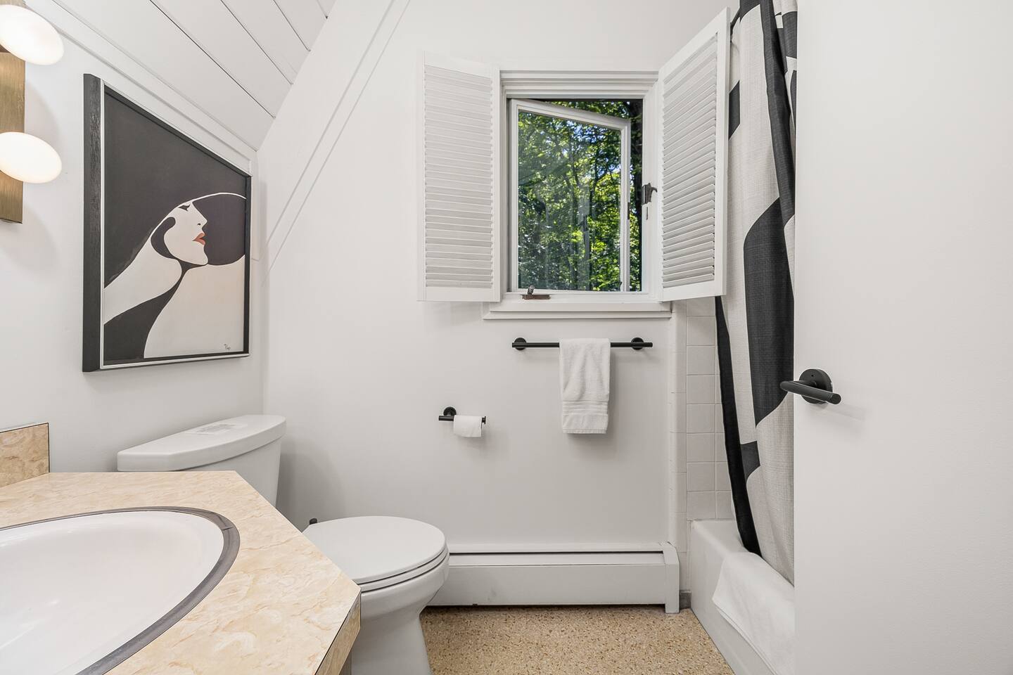 Escape to Leitchfield, your cozy cabin retreat nestled in the woods of Middletown, NY. This modern A-frame cabin blends rustic charm with contemporary comforts, creating the perfect setting for relaxation and reconnection. High vaulted ceilings, a ceiling fan, and large windows fill the open-concept living space with beautiful natural light, inviting you to unwind from the moment you arrive. Bed & Bath - Bedroom 1: A serene primary suite with a King bed, and clothing storage. - Bedroom 2: A comfortable room with a Queen bed and cozy lighting. - Bedroom 3: A quiet space with a Queen bed and closet, perfect for reading or remote work. - Amenities: Enjoy premium linens from Parachute & Brooklinen, shower amenities from Public Goods, and a hairdryer. Kitchen & Dining - A fully equipped kitchen featuring a Sub-Zero fridge, stove, oven, microwave, and a brand new Air Fryer. - Coffee Station: Drip and Keurig coffee makers are available. - Essentials: The kitchen is stocked with cookware, wine glasses, and cooking basics like oil and salt. - Dining Area: Gather around the dining table with seating for six. Indoor Comforts - Entertainment: Relax with our Sonos Stereo System and an HD TV with Amazon Prime, Hulu, Apple TV, and Chromecast (personal logins required). - Connectivity: Stay connected with fast WiFi and an Ethernet option. - Unplug: Enjoy our collection of books and board games. - Climate Control: The home is kept comfortable year-round with a modern ductless heating and air conditioning system. Outdoor Oasis - Private Deck: Unwind on the spacious deck with seating nestled among the trees. - Firepit: Gather around the firepit in Adirondack chairs for an evening of conversation and stargazing. - Grill & Dine: Fire up the BBQ grill for a summer cookout and dine al fresco at the outdoor table for six, illuminated by ambient evening lights.