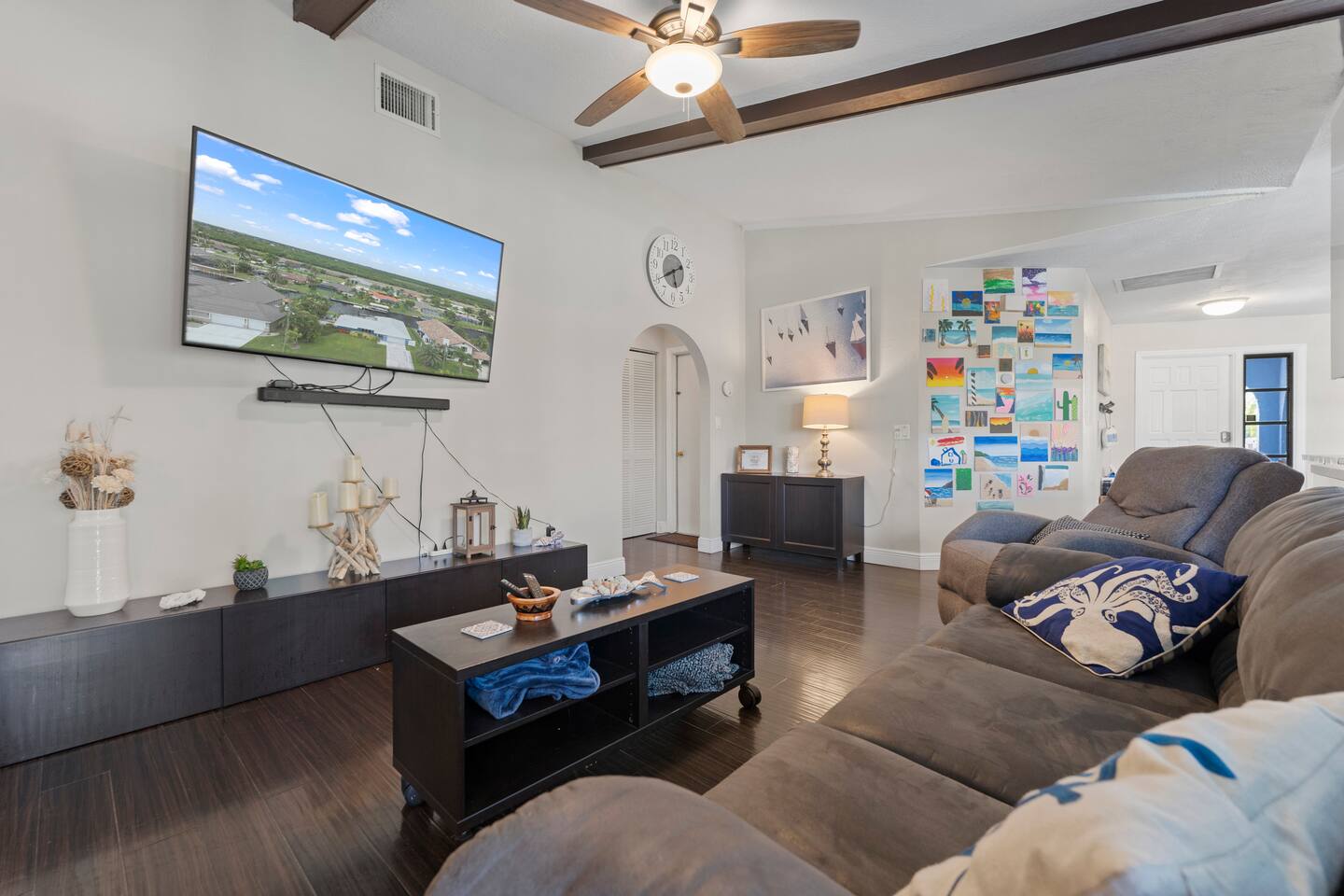 Escape to this family-friendly, canal-front oasis in Cape Coral! This 3-bed, 2-bath home comfortably fits 6 guests. Enjoy a heated pool, private dock, and a fire pit. Perfect for a relaxing Florida getaway with direct Gulf access. Just minutes from Fort Myers Beach and Sanibel Island, this vibrant retreat offers the ultimate indoor-outdoor living experience.