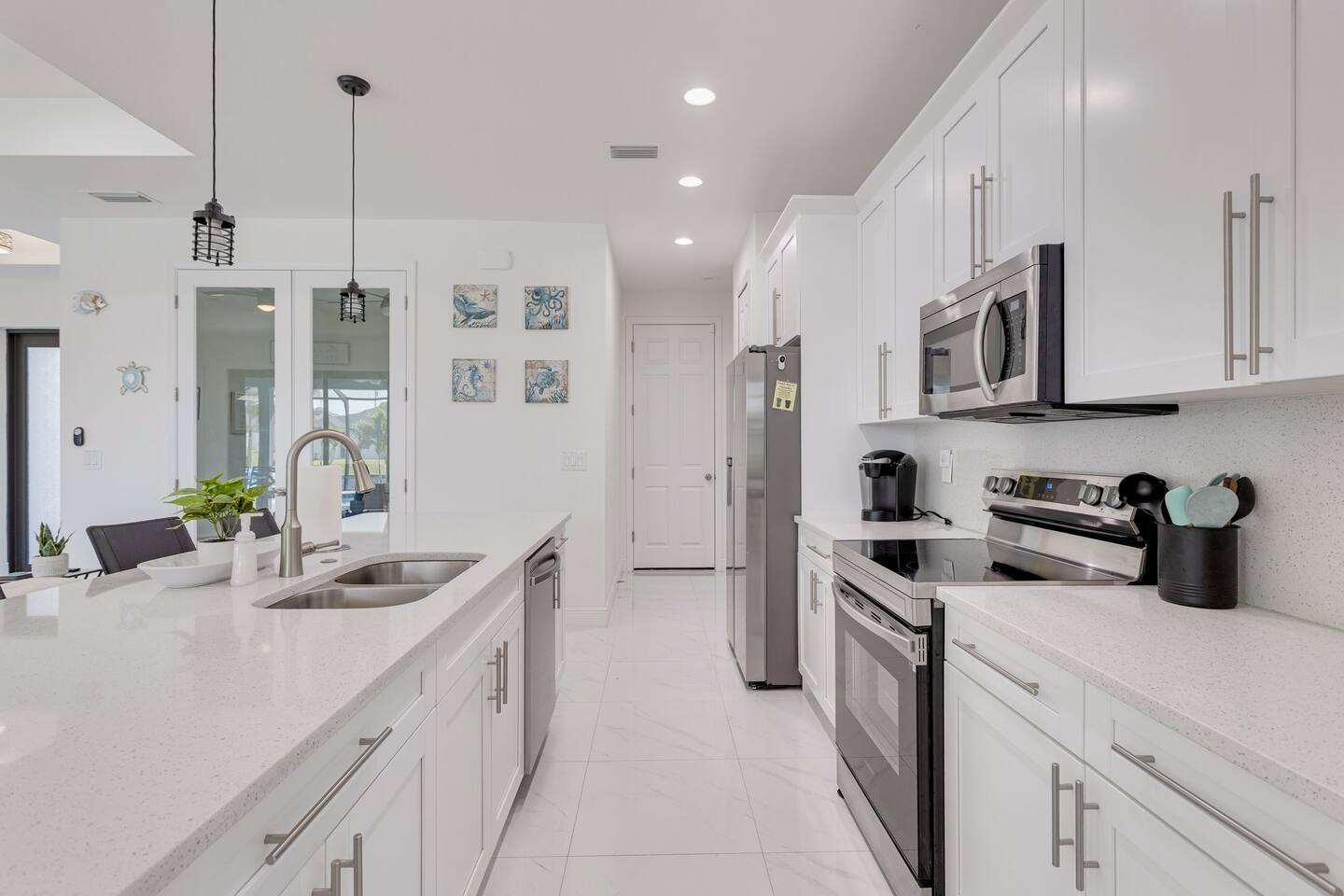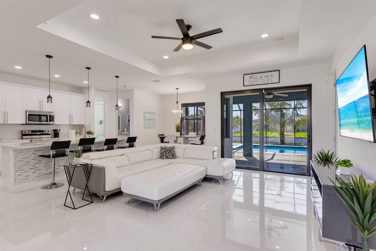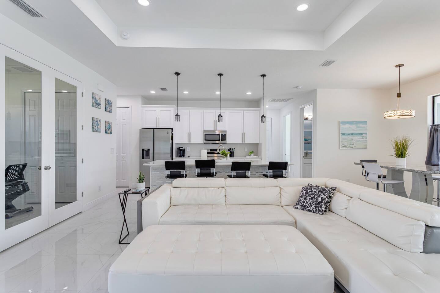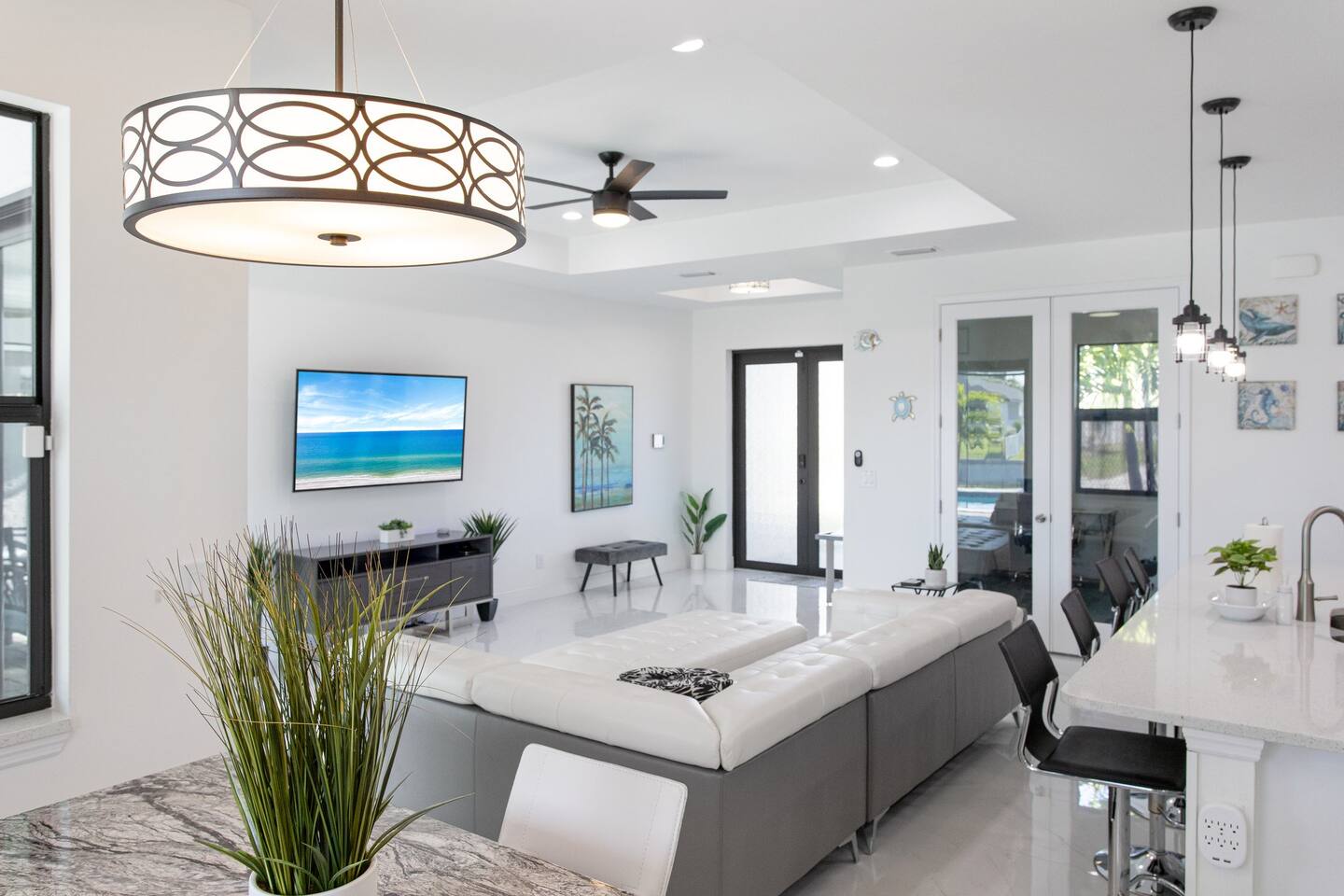 Escape to your own slice of paradise in this spacious and stylish 3-bedroom, 2-bathroom vacation rental in Cape Coral. With modern furnishings, a private office, and a sunny lanai with water views, this home has everything you need for a luxurious stay. Fire up the gas grill and dine outside on the patio or dip in the pool. Later, take a short drive to Sun Splash Family Waterpark or visit Fort Myers Beach and Sanibel Island.